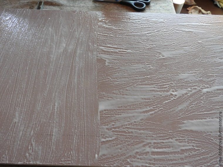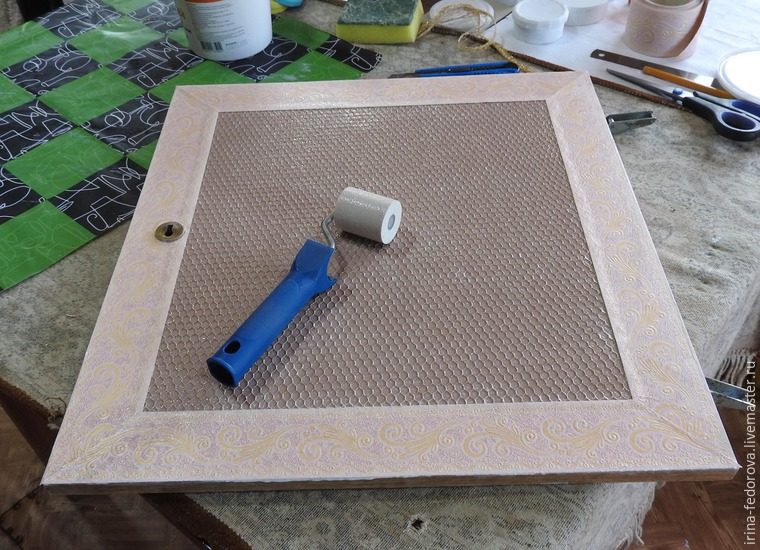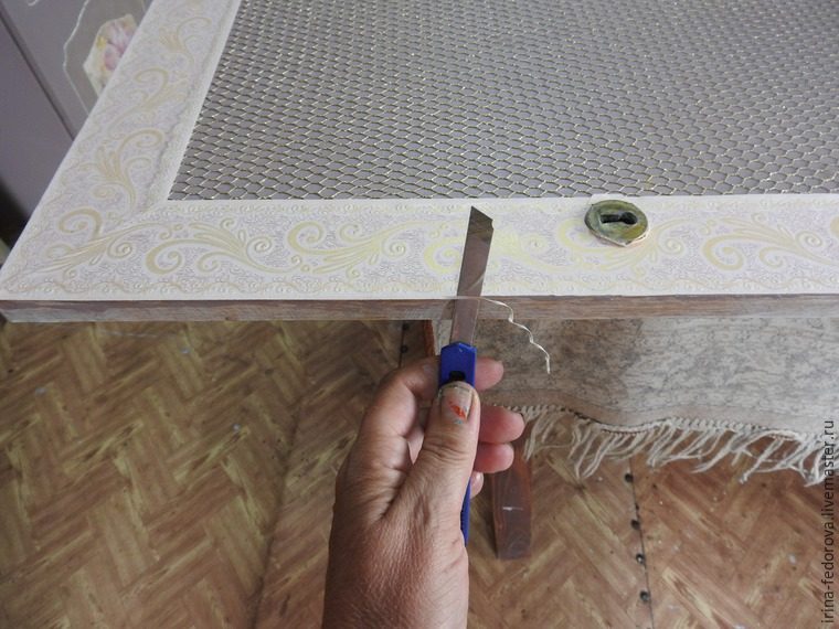 5. Наносим клей ПВА кистью на дверцу, наносим обильно и накладываем сетку, разравниваем руками, лишний клей промакиваем тряпочкой. Затем клей наносим на бордюр и приклеиваем его. Бордюр должен заходить примерно на 1 см на сетку. Разравниваем его роликом или тряпкой кому как удобнее, выгоняя весь воздух из под него. Ставим на просушку 15 час.