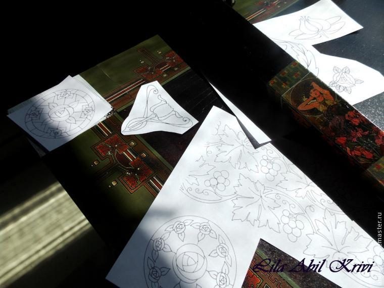 Копирки у меня под рукой не оказалось, поэтому я перевела картинку на кальку простым карандашом. Лучше, чтобы мягкость карандаша была высокой, так рисунок легче ляжет на поверхность стола. Кладем кальку, обводим рисунок с обратной стороны и получаем переведенное изображение на поверхности. Снова переворачиваем кальку, снова обводим и т.д.