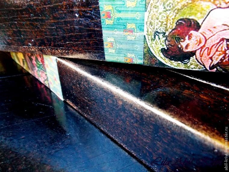 Не забываем про внутреннюю сторону нашего шедевра. Я покрывала ее морилкой черного цвета, предварительно разбавив ее водой. Делала это для того, чтобы фактура дерева казалась полупрозрачной, не глухо замазанной, а как будто покрытой патиной.