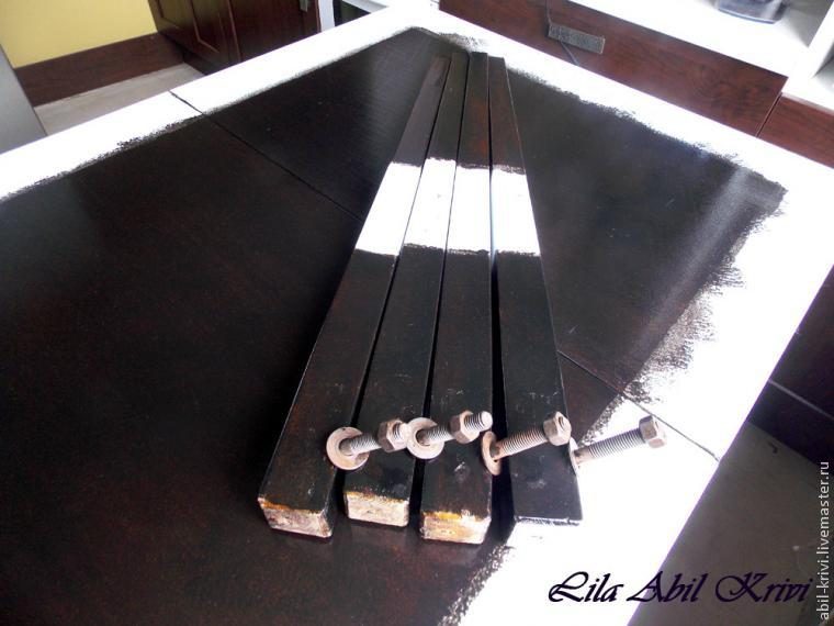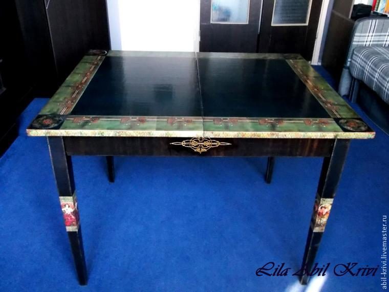 Затем занимаемся внешней поверхностью. Наклеиваем подготовленные распечатки по периметру крышки стола, сушим. Попутно просматриваем степень готовности ножек и дорабатываем их.