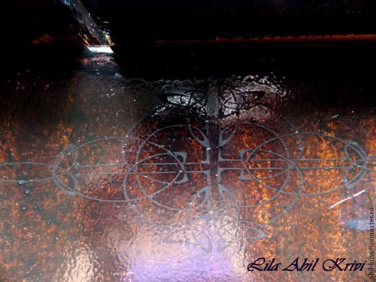 Сушим, чуть-чуть промакиваем битумом, приглушая блеск. Покрываем слоем лака. Сушим.