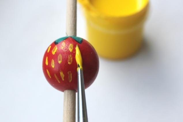 Потребуется: Деревянные бусины диаметром от 1,5 до 2 см, пластмассовые бусины зеленого цвета диаметром 0,6 см, грунт для деревянных поверхностей, акриловые краски — красная, зеленая, белая и желтая, акриловый глянцевый лак, кисточки.