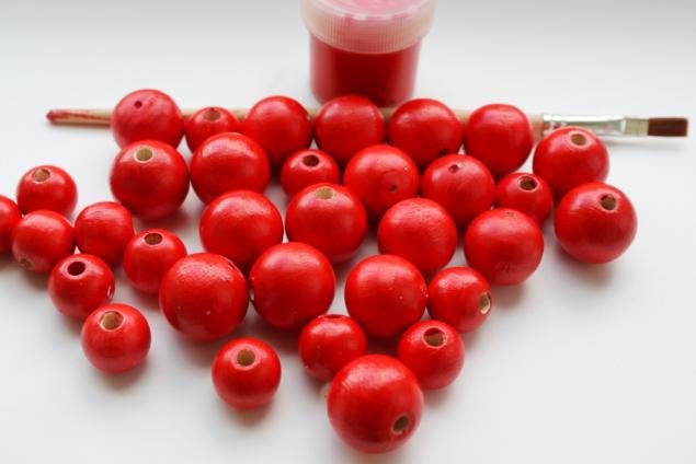 После того как грунт высох, придаем бусинам основной цвет при помощи красной акриловой краски. Краску кладем в 2-3 слоя, позволяя каждому хорошо просохнуть.