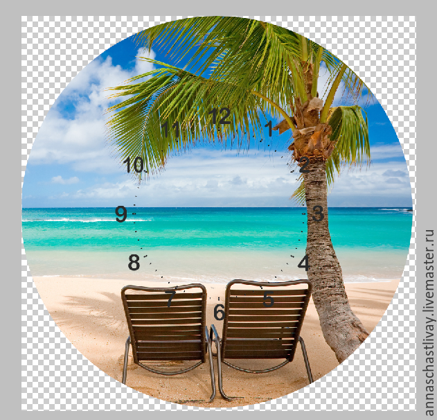 Первым делом ищем изображение пляжа, моря по душе. Может быть вы захотите взять свою личную фотографию с отпуска (так будет еще приятней поглядывать на часы).Я выбрала в интернете картинку. Также я нашла трафарет циферблата (по запросу «циферблат часов пнг»; для тех кто не знает, «пнг» — картинка на прозрачном фоне. Теперь открываем желаемое изображение в фотошопе. И выполняем следующие действия: