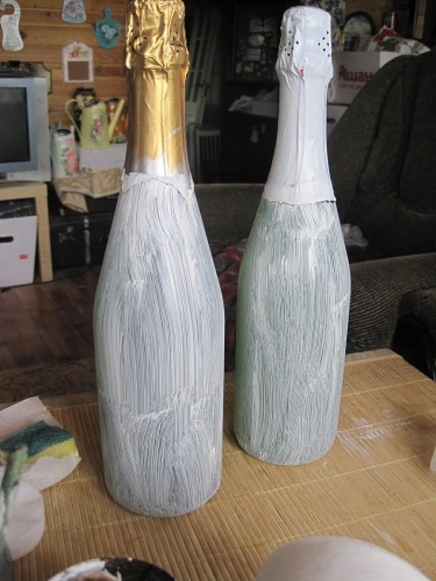 Ну, начали! Бутылки, сняв предварительно этикетку, обезжирили.Загрунтовали грунтом, и поставили сушиться, но можно и феном помочь :) Только не нагревайте сильно, без фанатизма, могут рвануть