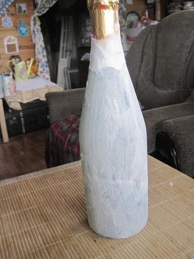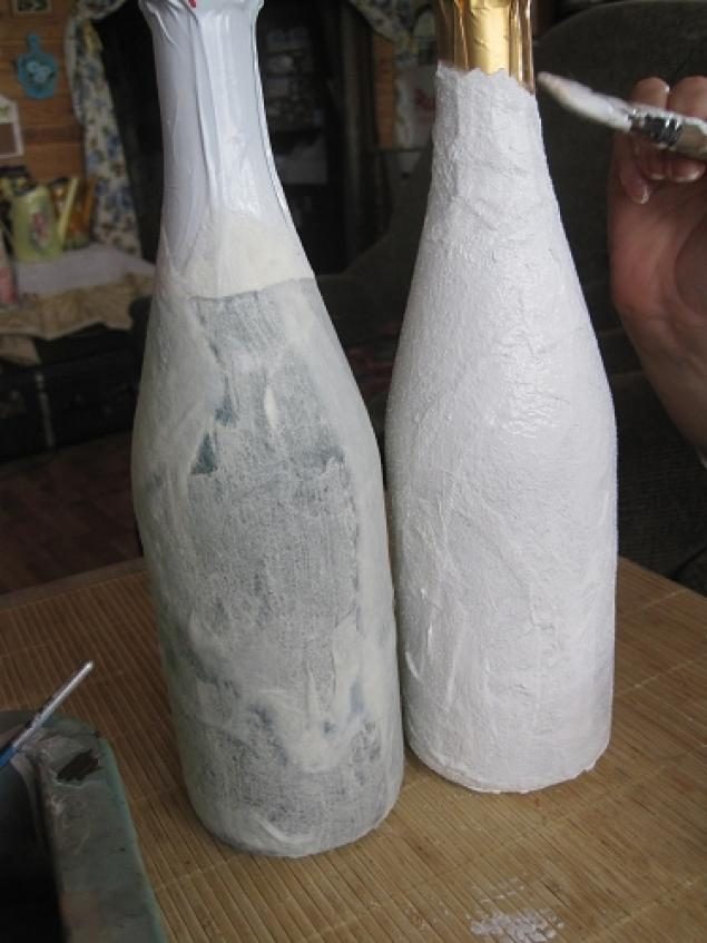 Далее всю бутылку, где нет сюжета зачпокиваем тонкой структурной пастой. Унас получается красивая шубка, почти норковая… Пасту разбиваем так чтобы остались маленькие пимпочки)))