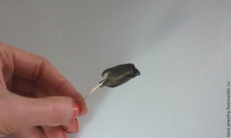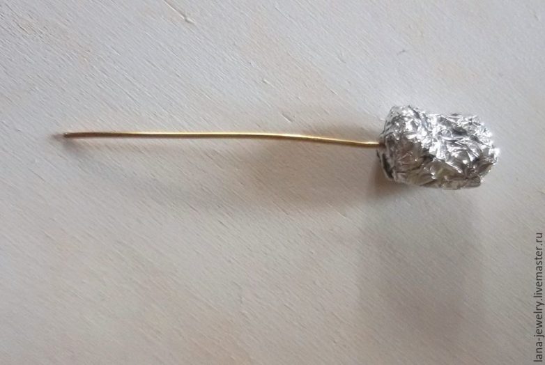 Делаем из фольги вот такую сердцевину. Поскольку лепестки у нас вытянутые, я сделала прямоугольную 1x0,5 см, вставляем туда проволоку или зубочистку, кому как удобнее. Зубочистку можно приклеить.