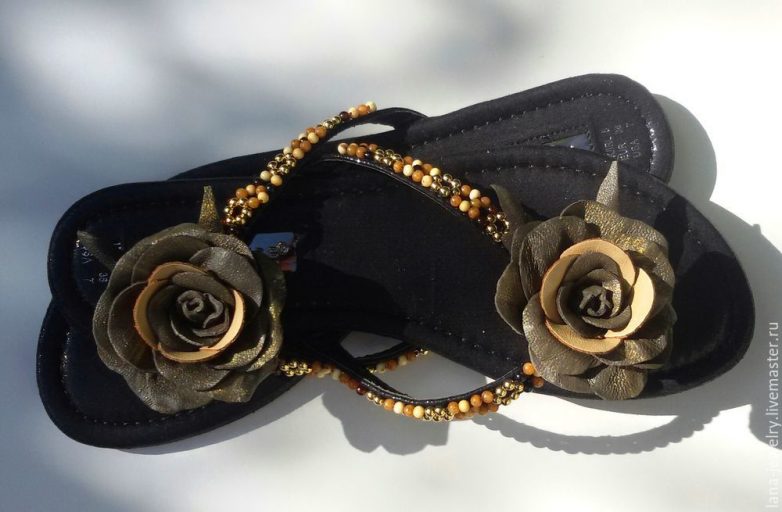 Сегодня я хотела бы представить вашему вниманию мастер-класс по декорированию неинтересных с виду шлепанец черного цвета. Для их чудесного преображения нужно лишь немного вашего времени, минимум материалов и хорошее летнее настроение!