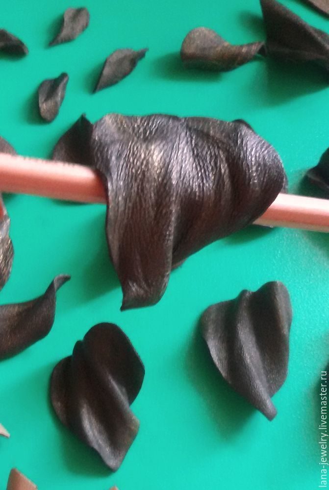 Листочки не скручивать, а сложить, чтобы получилась 1 продольная складка. Если кожа, которая есть у вас более тонкая, лучше промазывать кисточкой. Затем я оставила все это сушиться на ночь. Утром осторожно разворачиваем каждый лепесток и как бы накручиваем его на карандаш несколько раз и снова оставляем досушиваться не более чем на 1 час.