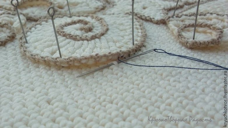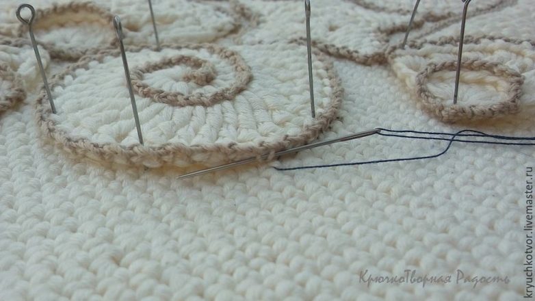 Пришивать же наши ракушки и морские звезды мы будем потайными стежками, цепляя иголкой задние дуги столбиков обвязки. Свободные края элементов, если они есть, не пришиваются. Старайтесь не делать слишком много стежков и не затягивайте их слишком сильно — ракушки должны сохранить объем. Если вы, как и я, пришиваете элементы к вязаному полотну, протягивайте нить под наружными петлями столбиков, тогда наша изнанка останется чистой и аккуратной.