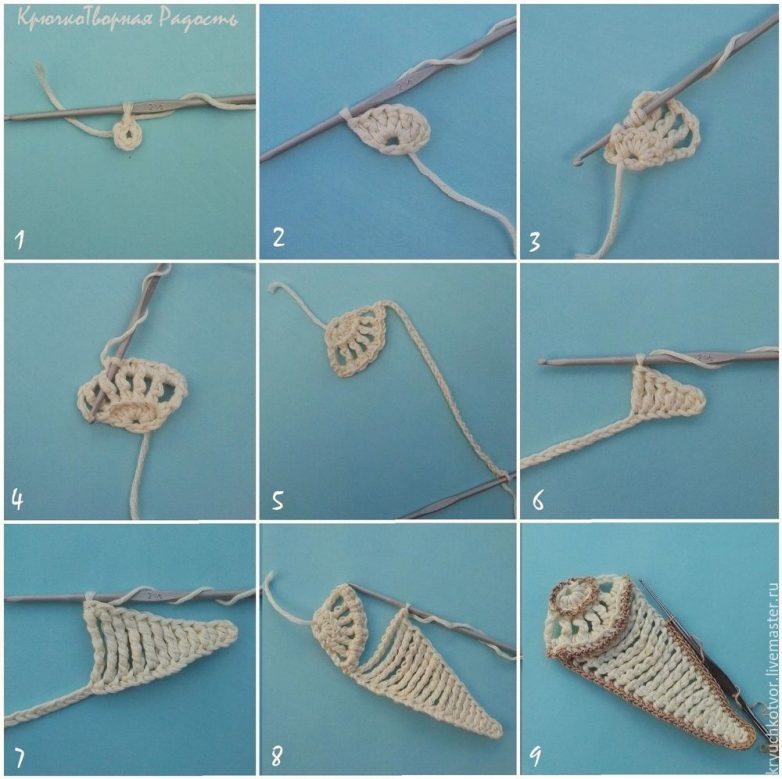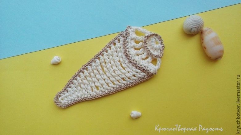 Набираем цепочку из пяти воздушных петель, замыкаем в круг.Делаем три петли подъема и вяжем в это кольцо шесть столбиков с накидом.Не замыкая вязание, поворачиваем его и делаем четыре петли подъема плюс одну петлю, далее чередуем — один рельефный лицевой столбик с двумя накидами в каждую петлю основания, одна воздушная петля; заканчиваем ряд столбиком с двумя накидами в подъемные петли предыдущего ряда. Внимание! При вязании рельефного лицевого столбика захватываем нитью не тело столбика, а перемычку между петлями основания предыдущего ряда.Поворачиваем вязание, вяжем третий ряд: одна петля подъема, два столбика без накида в пико из воздушной петли предыдущего ряда, один рельефный лицевой столбик без накида в столбик с двумя накидами предыдущего ряда (на этот раз при вязании захватываем нитью тело столбика); чередуем до конца ряда, заканчиваем столбиком без накида в подъемные петли предыдущего ряда.Не обрывая нити, набираем цепочку из тридцати двух воздушных петель.Вяжем в эту цепочку последовательно, по одному столбику в каждую петлю, начиная с третьей от крючка: два полустолбика с накидом, два столбика с одним накидом, два столбика с двумя накидами.Продолжаем, теперь по одному столбику в каждую вторую петлю цепочки: два столбика с тремя накидами, два столбика с четырьмя накидами, два столбика с пятью накидами.И заканчиваем: два столбика с шестью накидами, два столбика с семью накидами, два столбика с восемью накидами; делаем соединительный столбик в последний столбик без накида предыдущего ряда.Обвязываем тонкой ниточкой верхушку ракушки и ее ободок уже знакомым нам способом; само тело конуса обвязываем одним рядом столбиков без накида.