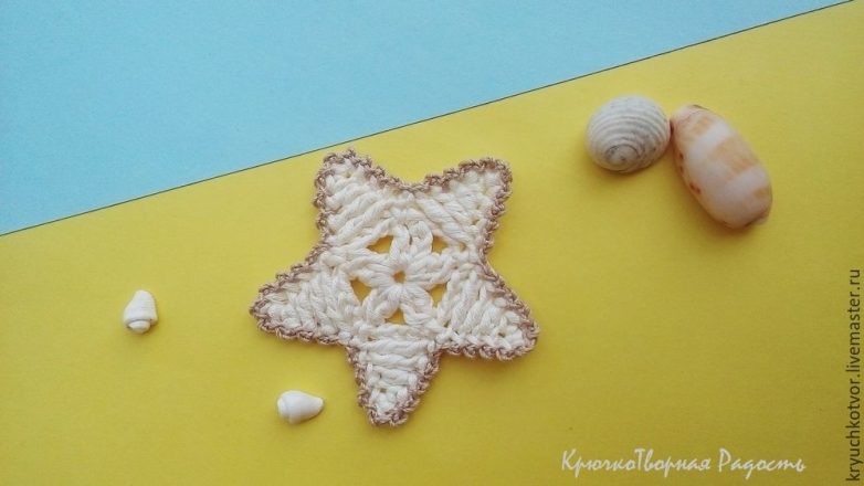Во-вторых, нам понадобится подходящая пряжа для наших ракушек и морских звезд. Я предлагаю взять чудесную хлопковую ниточку Charm от Vita Cotton (50г /106м) цвет № 4153 молочный (из этой пряжи, кстати, связана и моя сумка), а для украшения подойдет тонкая хлопковая ниточка Анна 16 от Seam (100г / 530м) цвет № 284 бежевый.