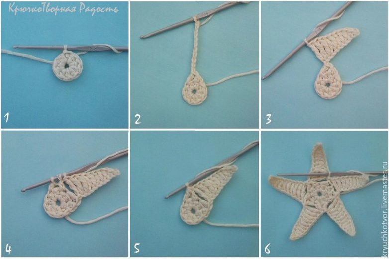 Набираем цепочку из пяти воздушных петель, замыкаем в кольцо, делаем три петли подъема и вяжем в это кольцо девять столбиков с накидом; замыкаем ряд соединительным столбиком.Делаем одну петлю подъема, вяжем один столбик без накида в следующую петлю основания, одну петлю пропускаем, вяжем столбик с накидом во вторую от крючка петлю основания; а затем набираем цепочку из десяти воздушных петель плюс одну петлю подъема.Вяжем в эту цепочку последовательно: один полустолбик без накида, один столбик без накида, один полустолбик с накидом, четыре столбика с одним накидом, три столбика с двумя накидами.В ту же петлю основания круга, что и предыдущий столбик с накидом, вяжем еще один столбик с накидом, не провязывая его до конца; затем во вторую по счету петлю основания вяжем второй недовязанный столбик с накидом.Провязываем эти два столбика вместе, соединяя их вершинами.Снова набираем цепочку из одиннадцати воздушных петель и точно так же вяжем следующий луч звезды, всего их получается пять; замыкаем ряд соединительным столбиком в самый первый столбик с накидом этого ряда.Обвязываем тонкой нитью по контуру уже известным нам способом.