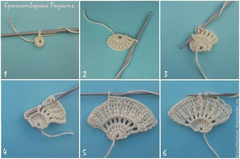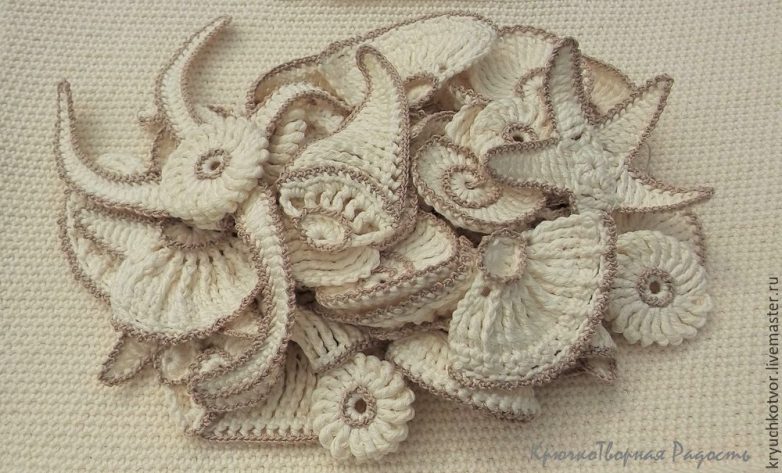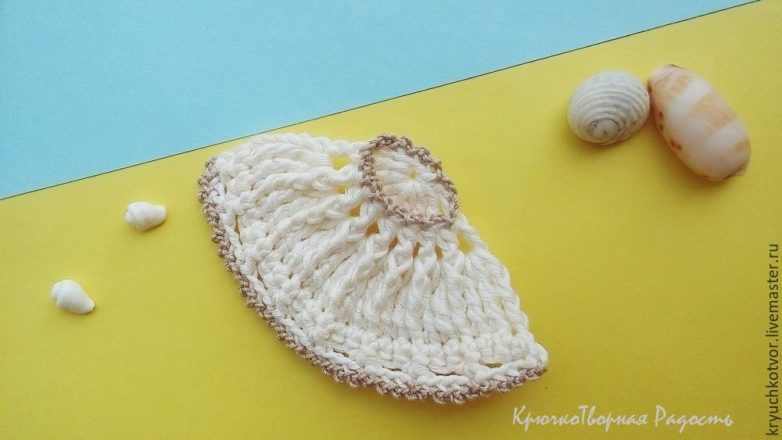 Набираем цепочку из пяти воздушных петель, замыкаем в кольцо.Делаем четыре петли подъема и вяжем в это кольцо восемь столбиков с двумя накидами.Не замыкая вязание, поворачиваем его и вяжем второй ряд: три петли подъема плюс еще одна воздушная петля, далее чередуем — один рельефный лицевой столбик с накидом в каждую петлю основания предыдущего ряда, одна воздушная петля; заканчиваем ряд столбиком с накидом в подъемные петли предыдущего ряда. Внимание! При вязании рельефного лицевого столбика захватываем нитью не тело нижнего столбика, а перемычку между петлями основания предыдущего ряда.Поворачиваем вязание, вяжем третий ряд: пять петель подъема, два столбика с тремя накидами в пико из воздушной петли предыдущего ряда, один рельефный лицевой столбик с тремя накидами в столбик с накидом предыдущего ряда (на этот раз при вязании захватываем нитью тело нижнего столбика); чередуем до конца ряда, заканчиваем столбиком с тремя накидами в подъемные петли предыдущего ряда.Поворачиваем вязание, вяжем четвертый ряд: одна петля подъема, один столбик без накида в каждую петлю основания предыдущего ряда.Поворачиваем вязание, вяжем пятый ряд: одна петля подъема, далее чередуем — три воздушные петли, один рельефный лицевой столбик без накида в каждый третий столбик предыдущего ряда; заканчиваем ряд столбиком без накида в подъемную петлю предыдущего ряда.Обвязываем тонкой ниточкой верхушку ракушки и ее кромку способом, аналогичным описанному выше.