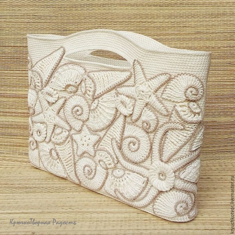 Ну вот, вязаные морские сувениры пришиты и сумочка почти готова!.. Осторожно отпарим ее с изнанки, дадим высохнуть — и вперед, в лето, притягивать восхищенные взгляды прохожих, выслушивать восхищения знакомых, и просто радоваться жизни!