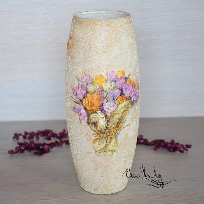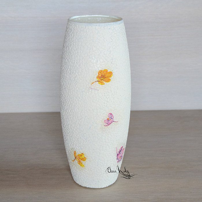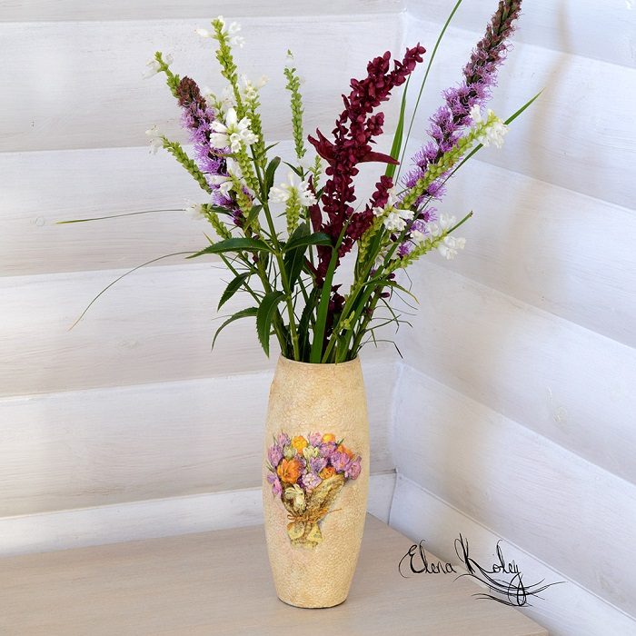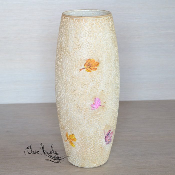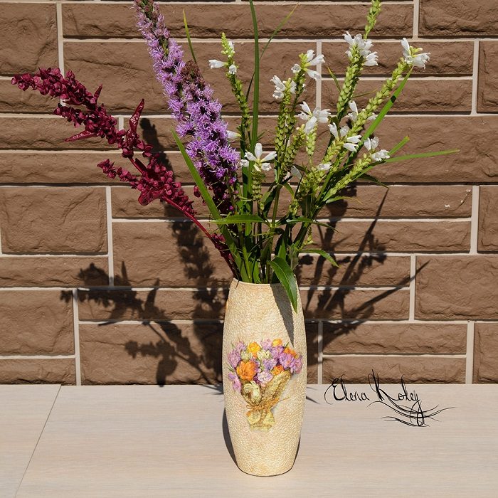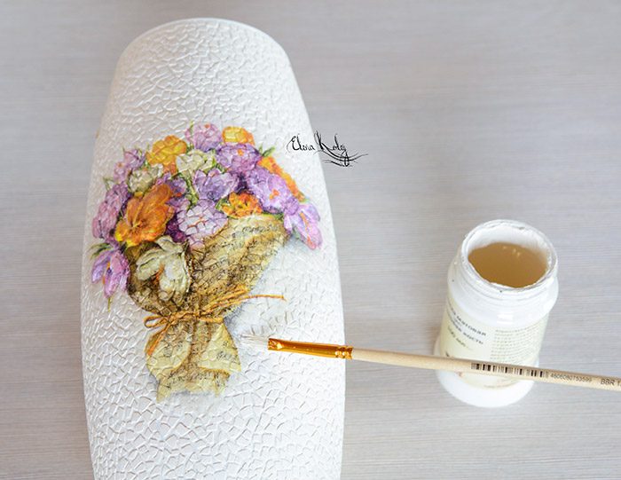 Финальный штрих — нанесение лака. Покрываем вазу тремя слоями лака с промежуточной просушкой. Наша очаровательная ваза готова!