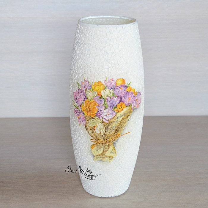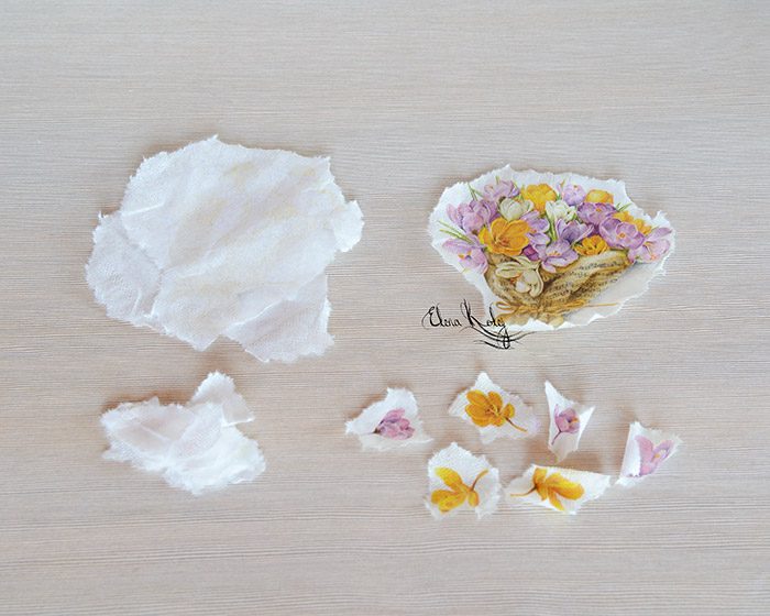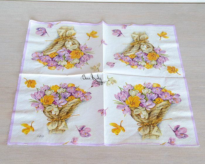 Берем декупажную трехслойную салфетку и вырываем руками нужные нам картинки (рваные края легче маскировать). На одной стороне вазы мы будем клеить букет крокусов, а на другой стороне разместим отдельные цветочки.