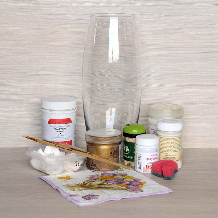 Стеклянную вазу будем декорировать в технике декупаж с использованием яичной скорлупы. Это достаточно трудоемкая техника, так как требует кропотливой работы и усидчивости, но скорлупа придаст поверхности вазы необычную фактуру и объемность.