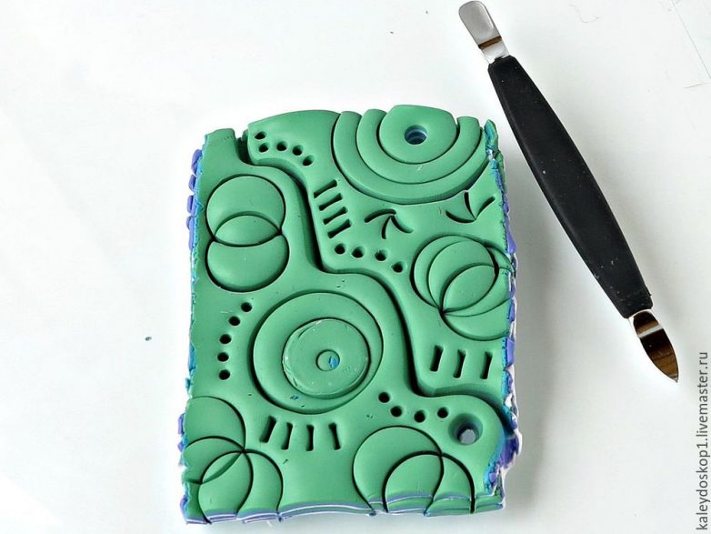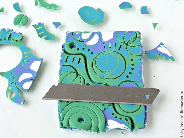 Для работы в технике мокуме-гане берем несколько слоев полимерной глины различных оттенков. Продавливаем глину разными предметами, при этом происходит перемещение разных слоев глины. После этого срезаем тонкие пласты и получаем удивительные узоры.