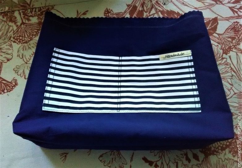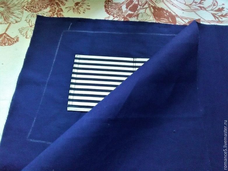 Чтобы сумка хорошо держала форму, я дополнительно уплотняю сумку плотной хлопковой тканью. В первом случае у меня синяя ткань, во втором белая.