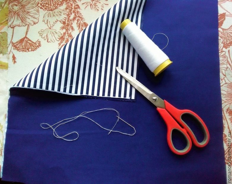 Ткань в полоску я использовала размером 40х40 см. Для этого я сложила ткань пополам, выровняла полоски, закрепила булавками, приложила выкройку и обрезала с припуском по краю как показано на второй фотографии.
