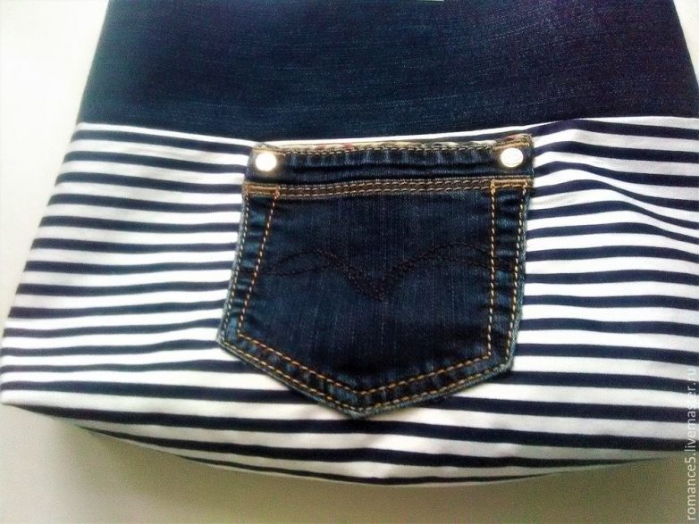 Для изготовления сумки понадобится кусок джинсовой ткани и кусок ткани в полоску. Джинсовая ткань это верхняя часть сумки, в полосочку — нижняя часть сумки. Выкройка состоит из двух частей. Все размеры указаны на фотографии. Для верхней части сумки я использовала кусок джинсовой ткани размером 20х35 см. Как видно на первой фотографии выкройки расположены в зеркальном отражении, я их обвела и обрезала с припуском по краю.