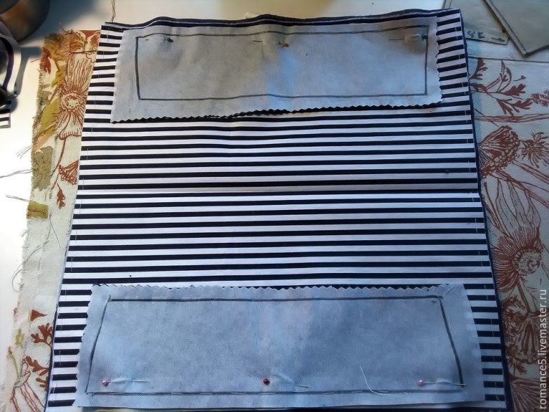 Верхнюю часть пришили. Сворачиваем ткань пополам, выравниваем по шву, стараемся чтобы полосочки тоже совпадали, закрепляем булавками и прошиваем по краям наметкой. Теперь берем выкройку подкладки и по ней равняем сумку. Очерчиваем по контуру маркером или мелом.