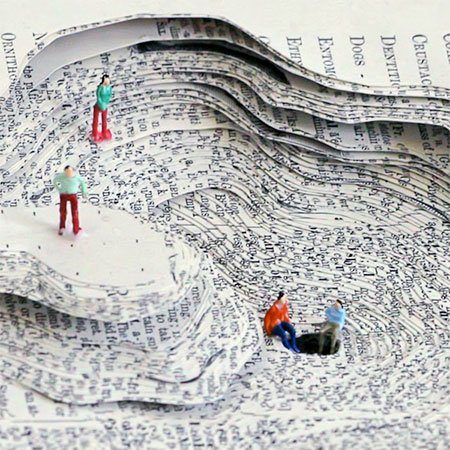 Миниатюрные ландшафты и горы художник вырезает из книг, сданных на макулатуру, поскольку трепетно относится к книгам как таковым и считает богохульством портить обычные книги.