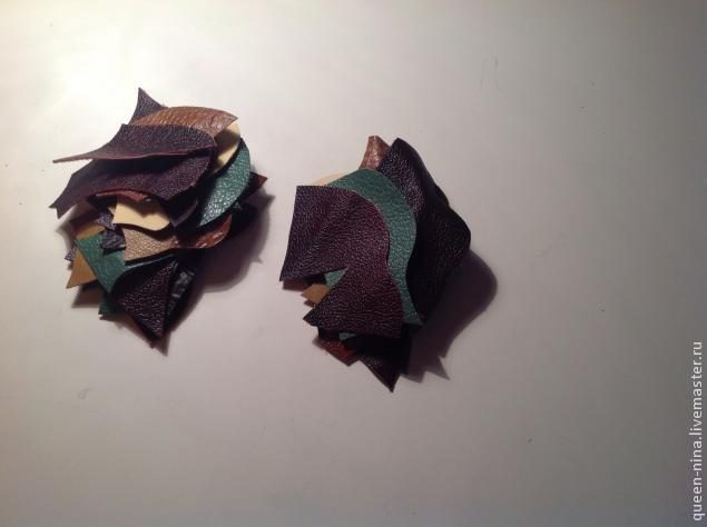 Затем переносим через копирку этот рисунок на вторые экземпляры выкройки. И начинаем вырезать кусочки. Второй экземпляр нам нужен, для того чтобы потом без проблем восстановить рисунок, а иначе замучаетесь раскладывать кусочки, несмотря на то, что они все пронумерованы. Дальше переносим выкройки на кусочки кожи. Я вырезаю кусочек и раскладываю его по выкройке и подбираю к нему подходящий цвет следующего кусочка. В результате получаются две такие кучки кожанных кусочков.