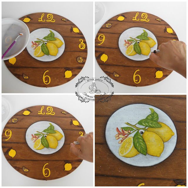 21. Приклеиваем цифры, лимоны, дольки, размещая на циферблате, с помощью клея Титан или другого универсального прозрачного клея. Подбираем часовой механизм и стрелки.
