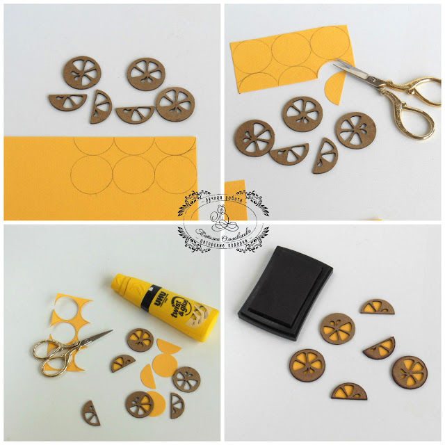 Из бумаги для пастели желтого цвета вырезаем подложку, которая будет проглядывать сквозь отверстия в дольках, приклеиваем ее с обратной стороны долек и затемняем края чернильной подушечкой.