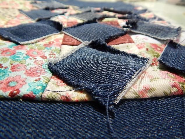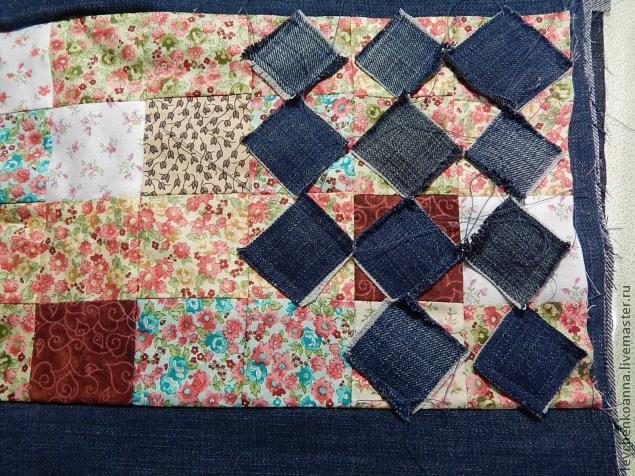 Теперь нарезаю оставшийся джинс на маленькие квадратики, размер и правильность квадратов не очень важны. У меня 32 квадратика 3 на 3, 4 на 4 см, всё на глазок. Я хотела добиться эффекта потёртости поэтому сложила джинсовые квадратики в тряпичный мешочек и постирала в стиралке с остальными вещами. После стирки немного обтрепались края. Прикладываю квадратик, вернее ромбик на своё место: