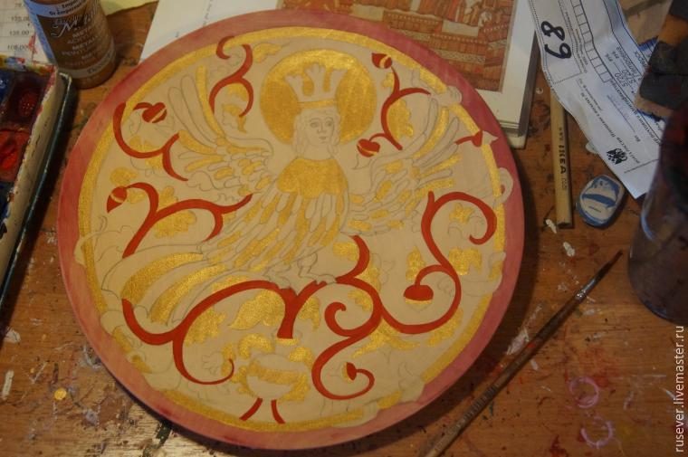 Следующий этап: начинаем работать с цветом. Сначала я сделала окантовку. Это акварель, краплак красный, очень сильно разведенный водой, поэтому бледный. Возможно, кому-то покажется неудобным начинать с краев, но видимо тут сказывается моя многолетняя работа с мезенской росписью, где роспись всегда начинается с охранительной красной линии по краям изделия. Так и здесь, мне кажется, так будет спокойнее :) Далее прохожу золотым акрилом все детали рисунка, которые предназначены быть золотыми. Их довольно много, но не надо бояться, благодаря классическому сочетанию цветов мы не рискуем удариться в китч.
