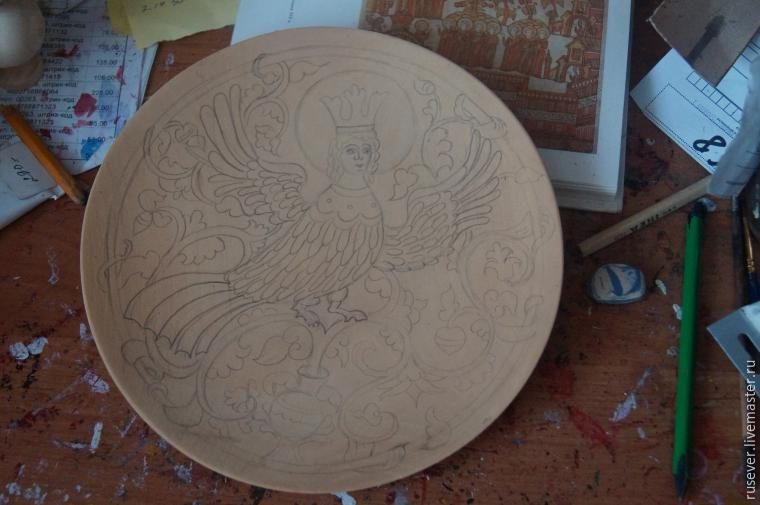 И вот наша готовая тарелка. Птица Сирин ожила. Тарелка отправилась на лакировку. Ее парадные фото можно будет увидеть в моем магазине уже в воскресенье. Прошу прощения за некий бардак на столе, но что уж поделать, именно так, спонтанно, она родилась, а уборка, как всегда, была отложена на потом :)