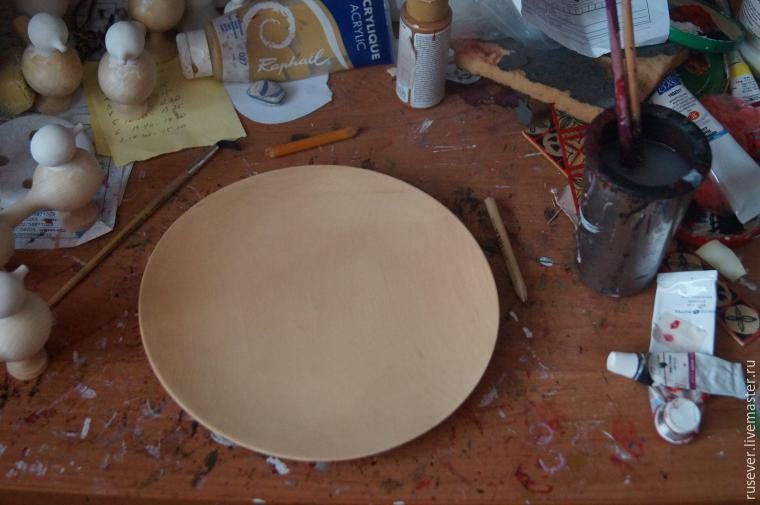 Для начала загрунтуем тарелку. В данном случае я использую для этого акриловую краску, в белила добавляю капельку охры, чтобы получился цвет, близкий к древесному. После того, как краска высохнет, изделие надо зашкурить наждачной бумагой, потому что как бы оно ни было хорошо зашкурено до грунтовки, краска все равно поднимет ворс, и в дальнейшем кисть будет плохо идти по дереву. Итак, добиваемся идеально ровной поверхности :)