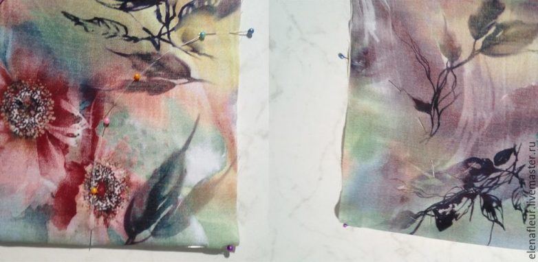 Рисуем горловину на ткани. Чтобы она была одинаковая с обеих сторон, перевожу линию на другую сторону с помощью булавок.