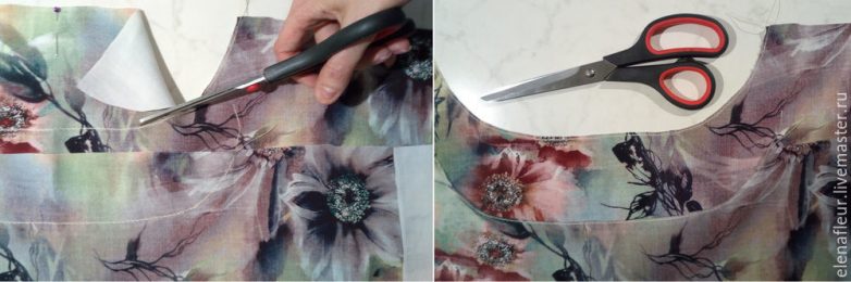 Прокладываем по линии строчку. Это сделать желательно, но не обязательно, так как ткань тонкая, легко растягивается во время дальнейшей обработки. Вырезаем горловину, отступив 3 мм от шва.