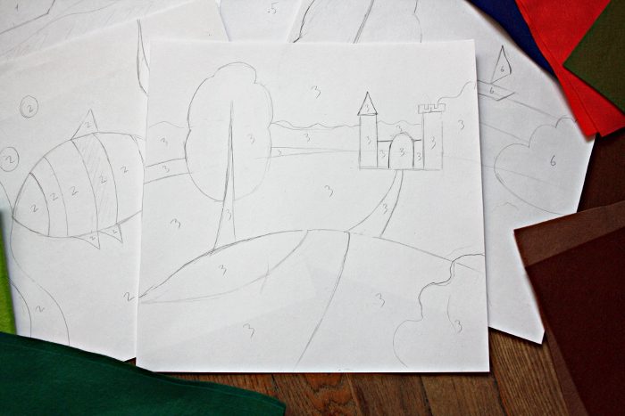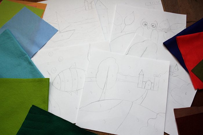 После этого я вырезала из плотной бумаги шесть квадратов 30х30 см (размер будущих деталей в готовом виде), перенесла на них рисунки и купила листовой фетр подходящих цветов.