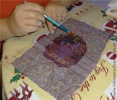 Теперь аккуратно начинаем снимать файл, при этом придерживая край салфетки, чтобы она не потянулась за файлом. Сняв аккуратно файл, приклеиваем салфетку клеем ПВА, разведённым с водой 1:1. Можно это делать мягкой синтетической кисточкой, а можно и пальцами. Приклеиваем от центра к краям, выгоняя пузырьки и разглаживая складочки. Если много раз водить по одному и тому же месту, то салфетка может порваться, поэтому делайте всё аккуратно и не надавливая сильно. Я обычно после этого промокаю сухой, белой салфеткой, чтобы убрать излишки клея и заодно убираются и некоторые складочки. Только промокать надо легонько, иначе салфетка может порваться, либо потянуться за сухой салфеткой.