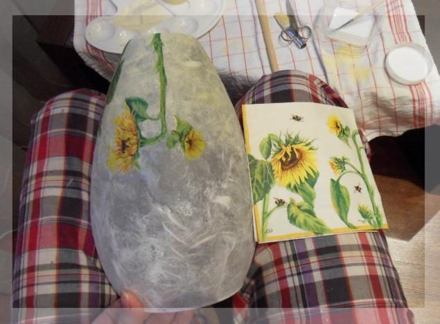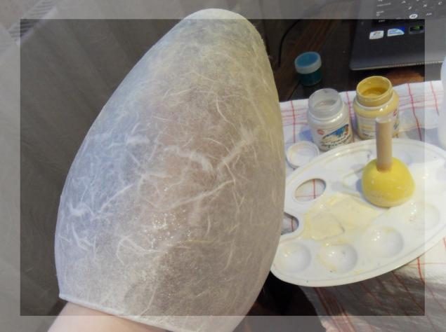 С помощью слегка смоченной губки и акриловых красок дополняем работу цветными тенями. Низ вазочки я сделала светло желтым, который плавно переходит к верху в белый.