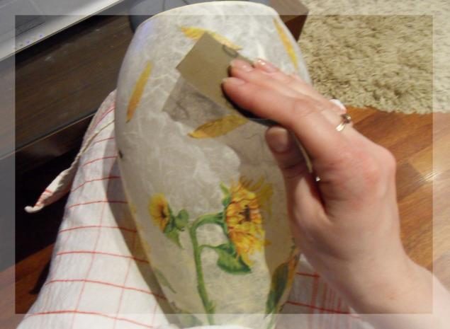 После того, как ваза просохнет, покрываем ее акриловым лаком. Как лак высохнет шкурим мягкой наждачной (шлифовальной) бумагой.