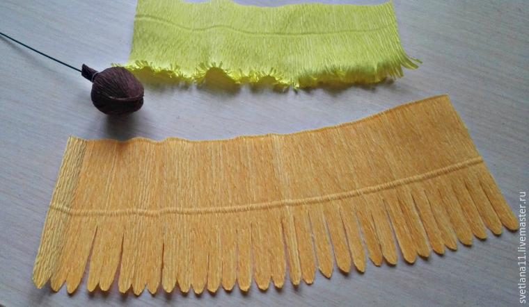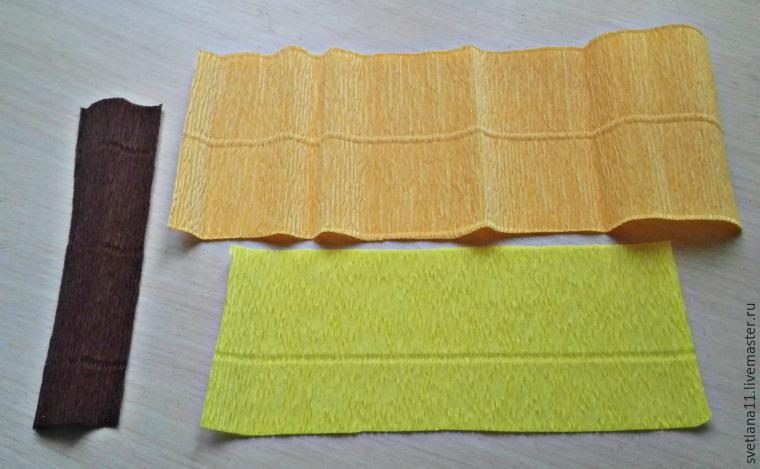Коричневую гофру режем полосочкой 3х15 см, оранжевую гофру 10х30 см, желтую 7,5х20 см.