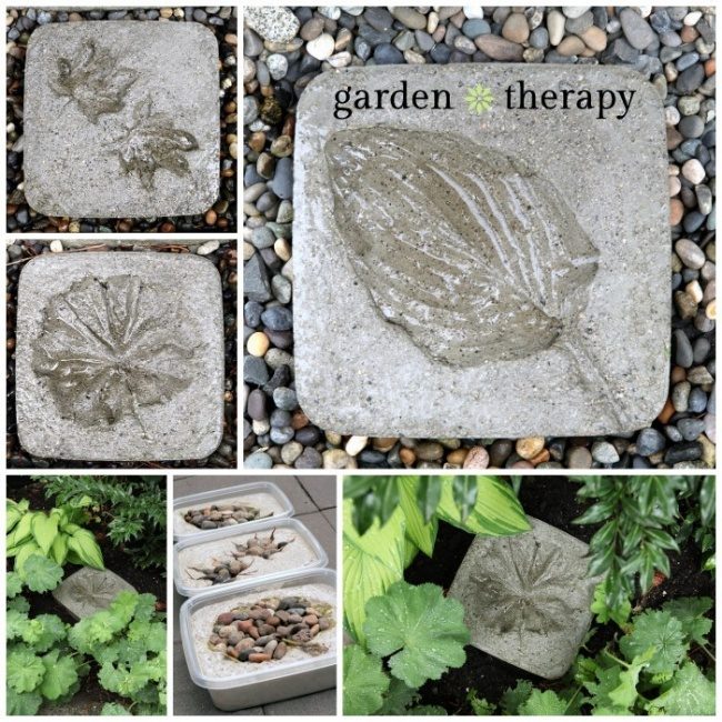 С помощью пластиковых контейнеров, бетона и листьев тоже можно сделать очень красивые блоки для дорожки.