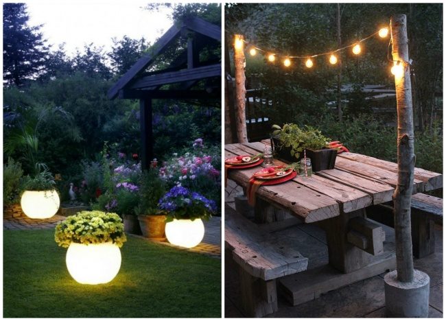 Подсвеченные цветочные горшки в вечернем саду выглядят восхитительно. А еще можно сделать гирлянду из лампочек.