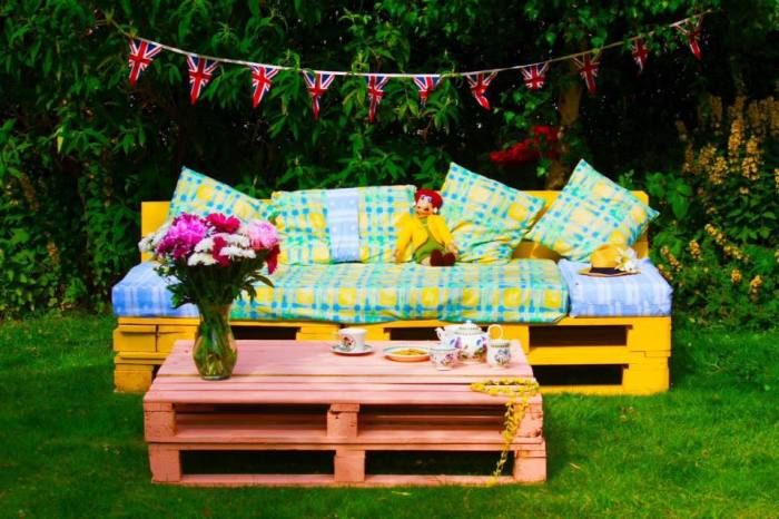 Мебель для дачного участка из грузовых поддонов — это ярко и красочно.