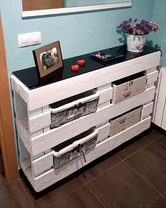 Из европоддонов можно сделать узкий, но довольно вместительный комод для малогабаритной квартиры.