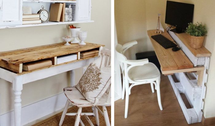 Прекрасная идея — соорудить из паллет широкую полку с функционалом полноценного рабочего места. Такая необычная мебель и смотрится стильно и место экономит.