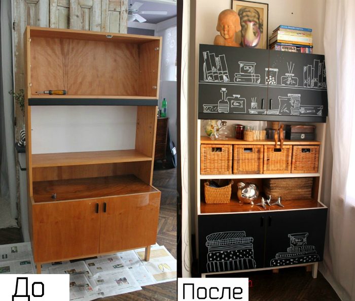 Старый сервант приобрел совершенно новый вид благодаря грифельной бумаге, наклеенной на дверцы.