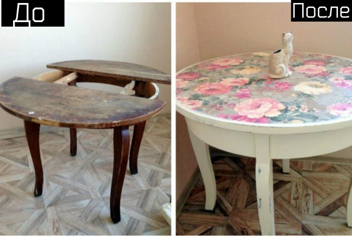 Невероятное преображение старого обшарпанного стола в белый обеденный столик с круглой столешницей, украшенной цветочным принтом, выполненной в технике декупаж.