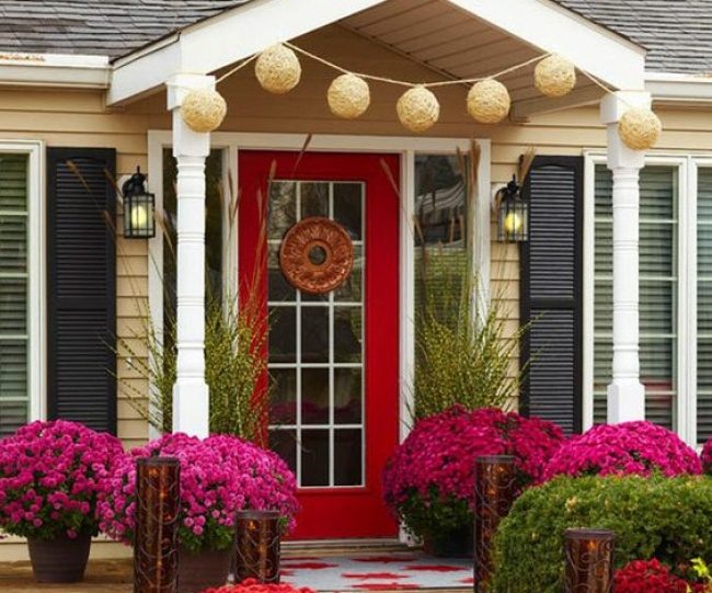 Яркие цветы, расположенные возле входа в дом, создадут хорошее настроение.